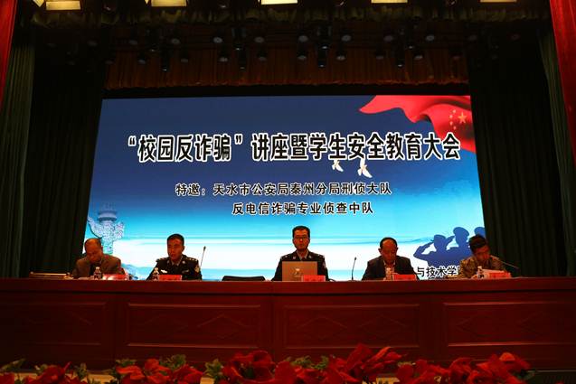 1115日晚,pp电子游戏平台网站在校文化礼堂举行“校园反诈骗”专题讲座暨学生安全教育大会。天水市公安局秦州分局刑侦大队反电信诈骗专业侦查中队陈方方、王朝东两位警官做了专题讲座,学院相关领导就政治安全、人身安全、财产安全、食品安全、实验室安全等方面做了全面讲解,并就pp电子游戏平台官网安全稳定工作做了安排部署。学院党总支副书记刘正、副院长李志锋、各班班主任、全体辅导员及在校学生共计650余人参加会议。