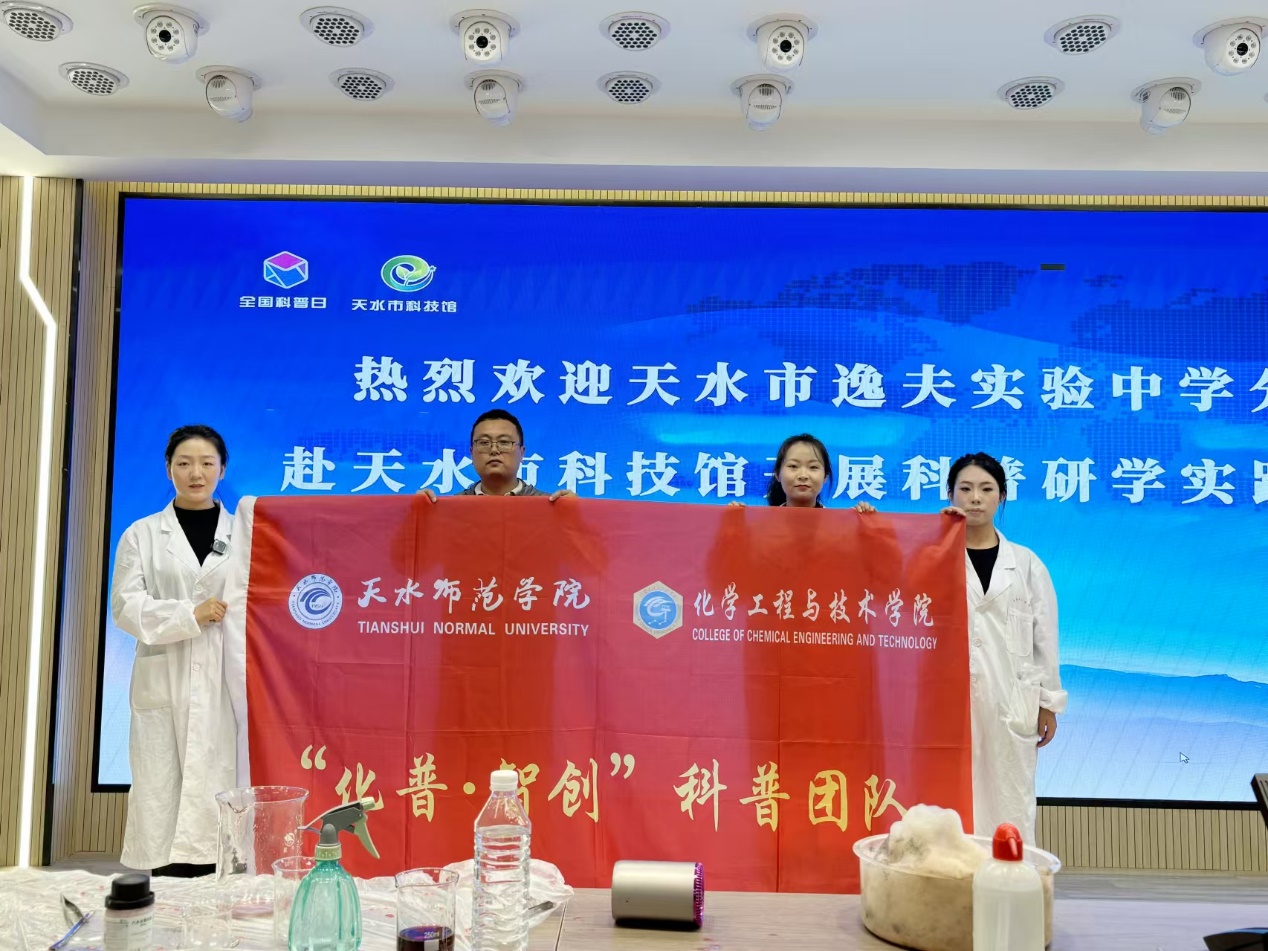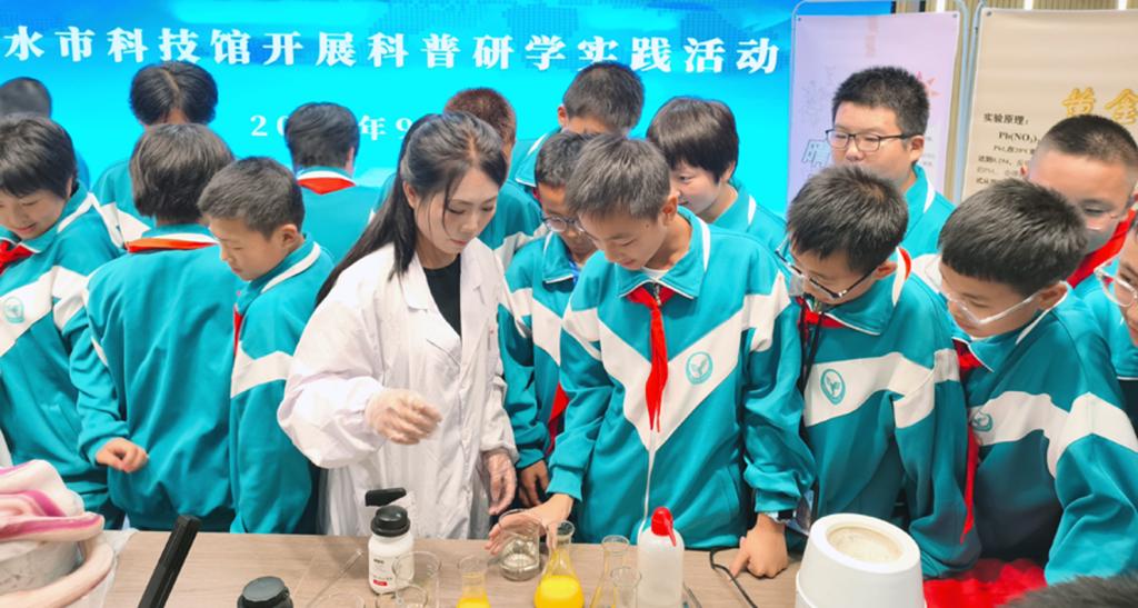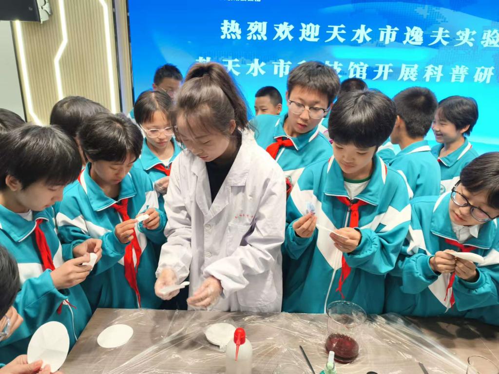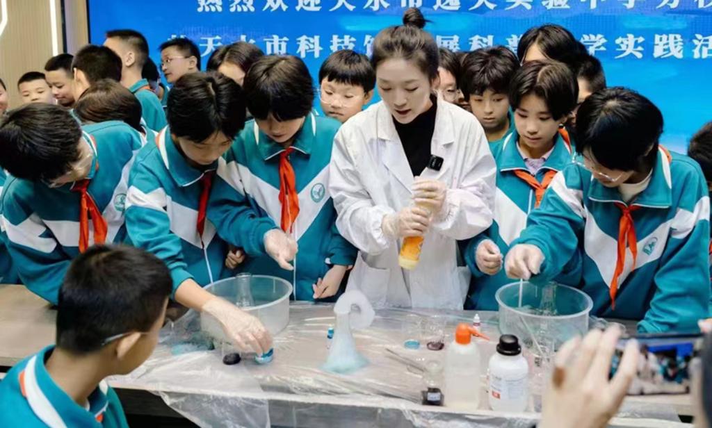 在天水市科技馆钱伟长学术报告厅,“化普·智创”科普团队为天水市逸夫实验中学分校七年级的师生展示了“大象牙膏”“黄金雨”“晴雨花”三个趣味化学实验,并指导学生积极参与实验操作。师生们近距离感受了化学的魅力,了解了科学知识,充分激发了学生们科学探索的兴趣,培养了他们的实践创新能力。