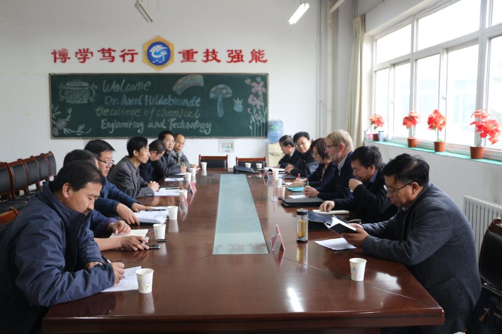 11月14日上午,pp电子游戏平台网站党政领导班子及部分教师在pp电子游戏平台网站会议室(3号实验楼211)举行座谈会欢迎德国专家Dr. Hildebrandt axel教授来pp电子游戏平台官网指导学科及专业建设等工作。刘新文院长首先代表pp电子游戏平台网站对Dr. Hildebrandtaxel来校指导pp电子游戏平台官网学科、专业及实验室等建设工作表示热烈的欢迎和衷心的感谢,之后刘院长介绍了学校的历史沿革、办学规模、学科研究、专业建设、人才培养等情况,希望德国专家此行能为pp电子游戏平台官网的专业、学科建设、课程设置、师资队伍及人才培养等方面给予指导,进一步推动pp电子游戏平台官网向应用技术型转型与发展。