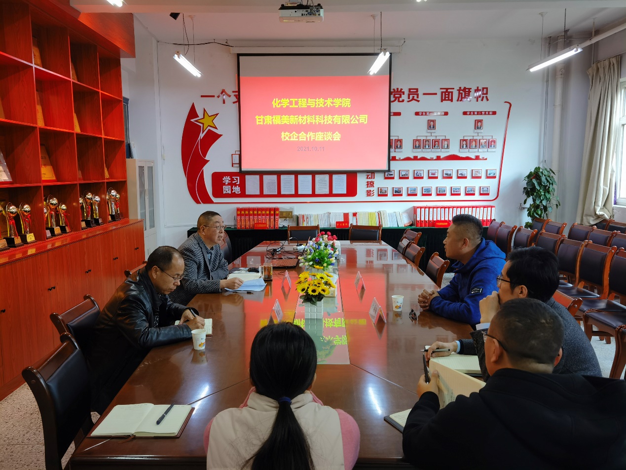 为深化校企合作,促进产学研结合,10月11日上午,pp电子游戏平台网站与甘肃福美新材料科技有限公司校企合作座谈会在3号实验楼211会议室举行。甘肃福美新材料科技有限公司侯国林主任,pp电子游戏平台网站院长马建泰教授及部分教师代表参加本次座谈会。