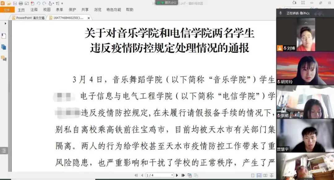 疫情防控,人人有责。为做实做强pp电子游戏平台官网学生防疫工作,切实保障学生生命安全和身体健康,做好疫情防控思想引领工作,各班积极响应党总支部署安排,及时召开“科学防控,抗击疫情”线上主题班会,全体同学认真学习学校、学院防疫制度和管理办法,由班干部领学《关于对音乐学院和电信学院两名学生违反疫情防控规定处理情况的通报》等文件,全体同学深刻领会文件精神,从典型违纪事件中吸取经验教训,严格遵守学校防疫规定,时刻提高警惕性,力争做到“自我教育、自我管理、自我服务、自我监督”,增强“一切听指挥”的大局意识,在疫情防控大考中彰显青年力量,努力争做真正能堪当大任的新时代合格大学生。同时,组织学生集体观看《中国机长》、《建党伟业》等红色影片,通过学习红色知识,传承红色基因,坚定理想信念,不断从红色基因中汲取前进的力量,勇担抗疫重任,在成为担当民族复兴大任时代新人的道路上努力奋进。