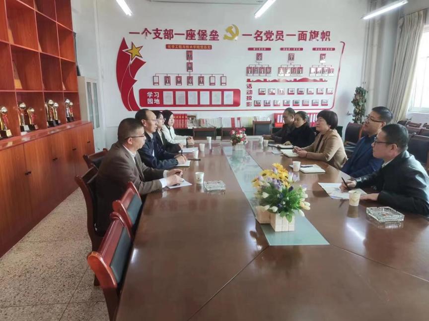 3月3日,甘肃金昌化学工业集团有限公司总经理张新和,实训基地主任鲁永强,人力资源部副部长樊海翠,人力资源部副主任科员陈松一行4人来pp电子游戏平台官网考察交流并参加相关工作座谈会。pp电子游戏平台网站党总支书记王小芳,副院长杨玲娟和分管就业工作的班主任、辅导员参加座谈会。